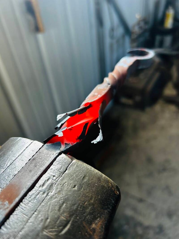 Forge welded fire poker and brush. Leaf and vine end with brass brushing or bottle opener end.